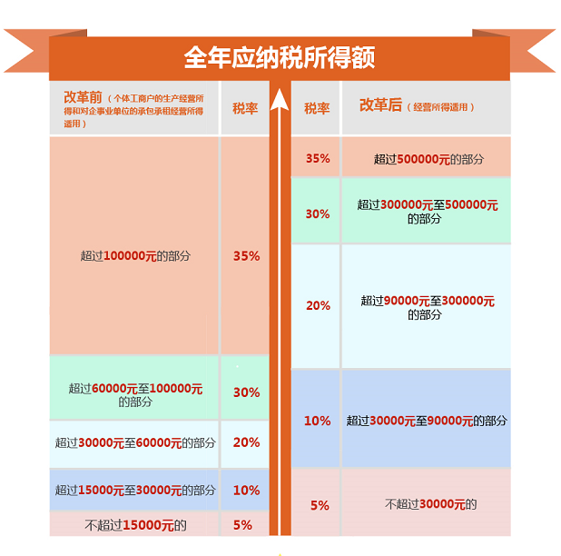 在稅率表的調(diào)整上,此次改革將更多地惠及中低收入群體,對(duì)勞動(dòng)性所得,以現(xiàn)行工薪所得3%-45%七級(jí)超額累進(jìn)稅率為基礎(chǔ),拉大3%、10%、20%三檔低稅率的級(jí)距,對(duì)經(jīng)營(yíng)性所得,在維持現(xiàn)行5%-35%五級(jí)超額累進(jìn)稅率的基礎(chǔ)上,也適當(dāng)擴(kuò)大了各檔次稅率級(jí)距,減輕了廣大經(jīng)營(yíng)業(yè)主的稅負(fù)。