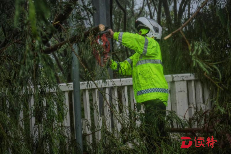 在9月18日新聞聯(lián)播中播放的臺風(fēng)現(xiàn)場畫面中,有一段正是艾力軍4人在羅沙路上清除路障過程中記錄的。當(dāng)時,艾力軍正拿起手機(jī)為同事記錄,突然一陣狂風(fēng)猛掃過來,姚書龍、陳展聰尚能在風(fēng)中勉強(qiáng)站住,而陳展廷卻因站立不穩(wěn)被風(fēng)吹著跑了近10米才停下。所幸,陳展廷抓住路邊的護(hù)欄才沒被吹倒。這段視頻在最近兩天也在社交軟件中廣為流傳,3位“小黃人”中2人頂風(fēng)艱難站立,1人被風(fēng)吹跑,看似“滑稽”的畫面中仔細(xì)品味,超強(qiáng)臺風(fēng)中堅(jiān)守崗位的艱辛在視頻中盡顯無疑。