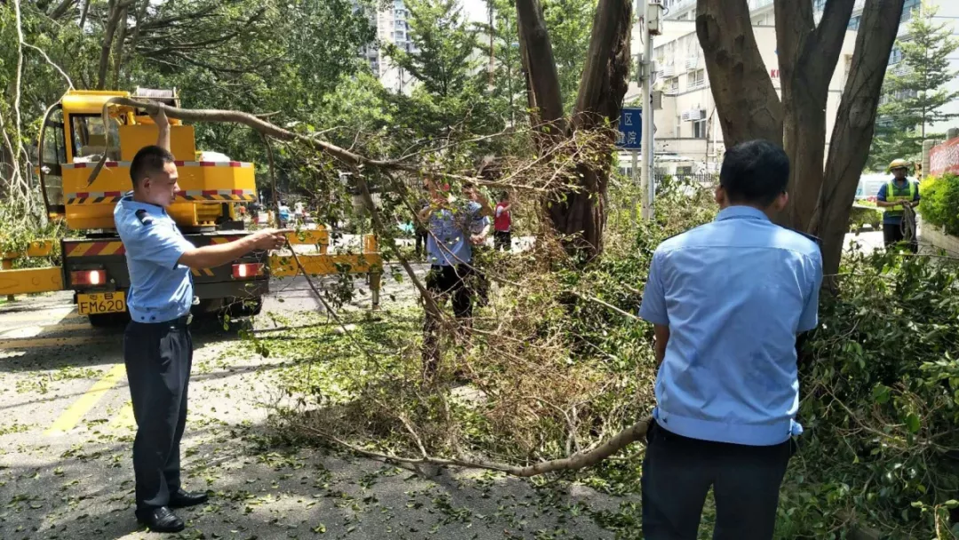 9月19日上午,福田區(qū)百花二路、三路,60多名身著藍(lán)色制服的警察和紅色馬甲的輔警格外顯眼,他們正在揮汗如雨地進(jìn)行災(zāi)后路障清理工作。