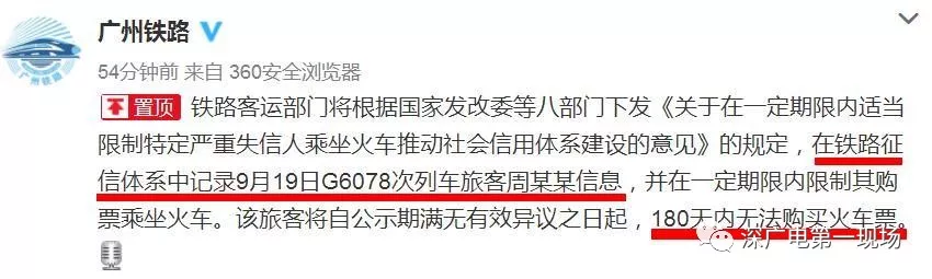 據(jù)@廣州鐵路今天上午10點(diǎn)25分通報(bào)稱,鐵路客運(yùn)部門將根據(jù)國(guó)家發(fā)改委等八部門下發(fā)《關(guān)于在一定期限內(nèi)適當(dāng)限制特定嚴(yán)重失信人乘坐火車推動(dòng)社會(huì)信用體系建設(shè)的意見(jiàn)》的規(guī)定,在鐵路征信體系中記錄9月19日G6078次列車旅客周某某信息,并在一定期限內(nèi)限制其購(gòu)票乘坐火車。