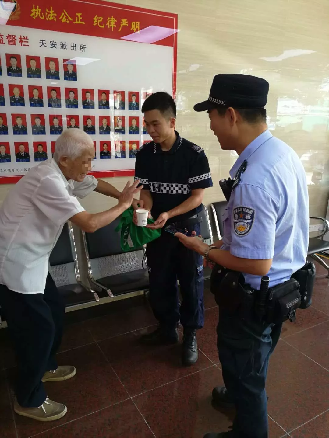 9月19日中午12時(shí)30分許,天安派出所巡防隊(duì)員在福田汽車(chē)站警銀亭值守時(shí),發(fā)現(xiàn)一名疑似走失老人,巡防員上前詢(xún)問(wèn)情況后立即將情況上報(bào)值班室。巡邏民警邱志堅(jiān)趕到現(xiàn)場(chǎng),由于老人高齡,語(yǔ)言不通,無(wú)法獲得更多有效信息,于是帶回派出所進(jìn)一步處理。