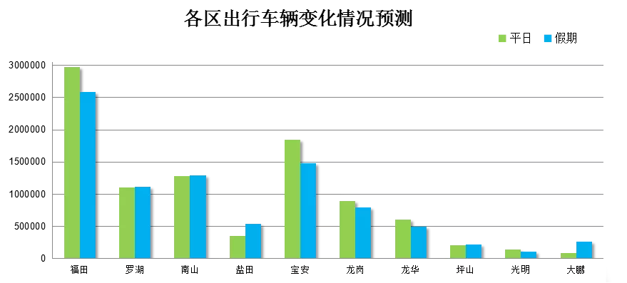 除以上兩個(gè)區(qū)域外,我市其余各區(qū)車輛會(huì)較平日有所下降,而原關(guān)外的福田、寶安、龍崗,出行車輛數(shù)下降較為明顯,整體來看,全市出行車輛數(shù)將減少6%。
