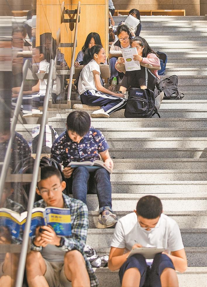 國慶長假期間,去圖書館“充電”成為不少深圳人的度假方式。由于深圳圖書館座位已滿,不少市民直接坐在階梯上閱讀學習。 深圳特區(qū)報記者 劉羽潔 攝