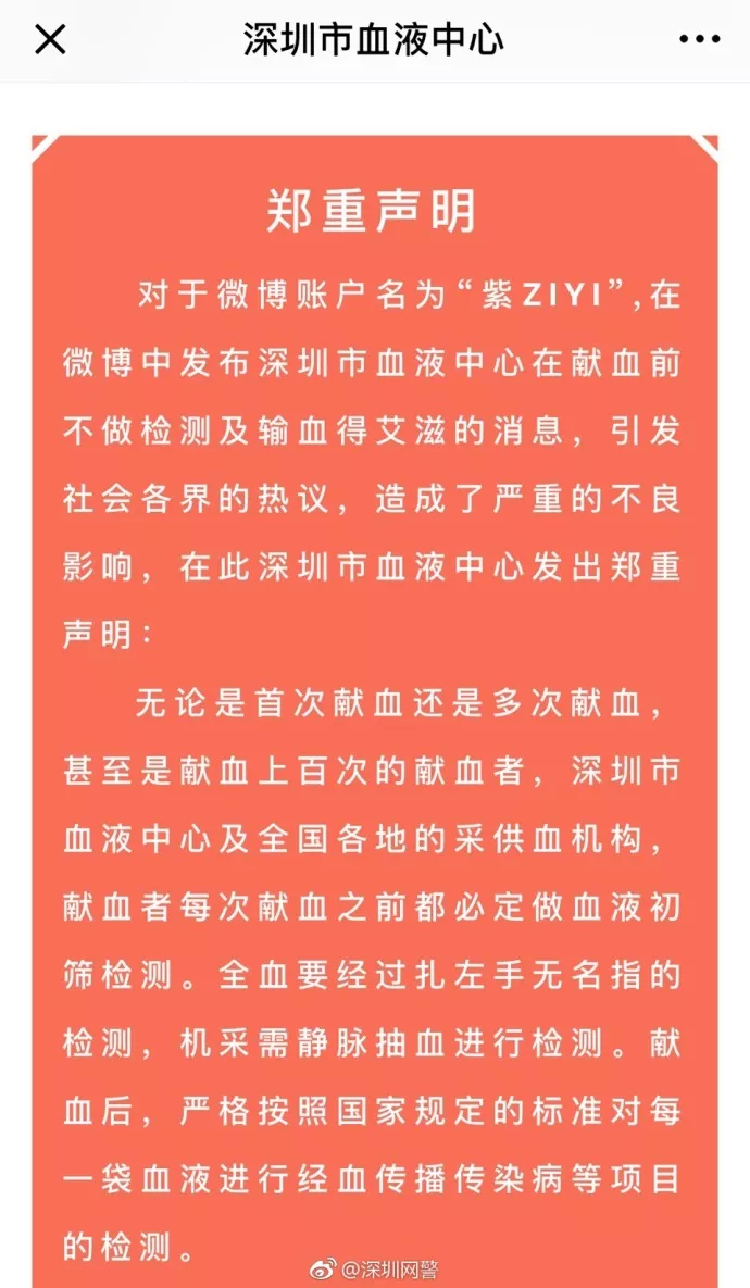 @深圳市血液中心發(fā)出鄭重聲明:無(wú)論是首次獻(xiàn)血者還是多次甚至是上百次的獻(xiàn)血者,每次獻(xiàn)血都必須做初篩檢測(cè),全血要經(jīng)過扎左手無(wú)名指的檢測(cè),機(jī)采需靜脈抽血進(jìn)行檢測(cè)。獻(xiàn)血后,嚴(yán)格按照國(guó)家規(guī)定的標(biāo)準(zhǔn)對(duì)每一袋血液進(jìn)行經(jīng)血傳播傳染病等項(xiàng)目的檢測(cè)。