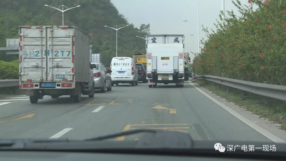 隨后,記者也來到了該路段,發(fā)現(xiàn)正如張先生所說,在轉南坪快速的輔道上,轎車與貨車并行現(xiàn)象隨處可見。在往南坪快速方向的路面標示也顯示,將之前的雙車道改為了單車道。