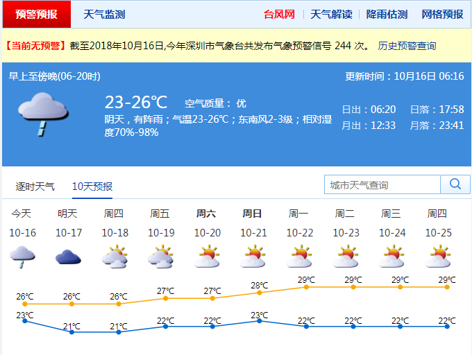 受弱冷空氣和切變線共同影響,16日深圳陰天有中到大雨,局部暴雨,伴有零散雷暴和5~6級陣風(fēng)。預(yù)計(jì)降雨將在中午前后減弱,氣溫下降3 ℃~4 ℃,最低氣溫低至21 ℃,最高氣溫在25 ℃左右。17日陰天間多云,偶有零星小雨,氣溫在21 ℃ ~26 ℃。18日起轉(zhuǎn)為多云到晴天,早晚清涼,空氣干燥。