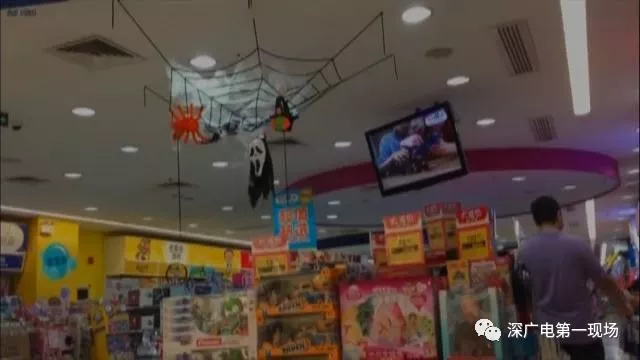 溜冰場工作人員:“就是萬圣節(jié)鬼節(jié)嘛,掛這些東西小孩們可開心了,還有小孩爬上去拽那些玩意,不會嚇到的,來滑冰的顧客臉上都會化妝扮鬼?!?/p> 玩具賣場萬圣節(jié)道具花樣多 魔鬼面具熱銷