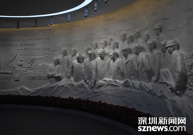 浮雕還原了1984年鄧小平第一次南巡期間,鄧小平、楊尚昆、王震等中央領(lǐng)導(dǎo)聽(tīng)取袁庚介紹蛇口工業(yè)區(qū)發(fā)展情況的歷史一刻。