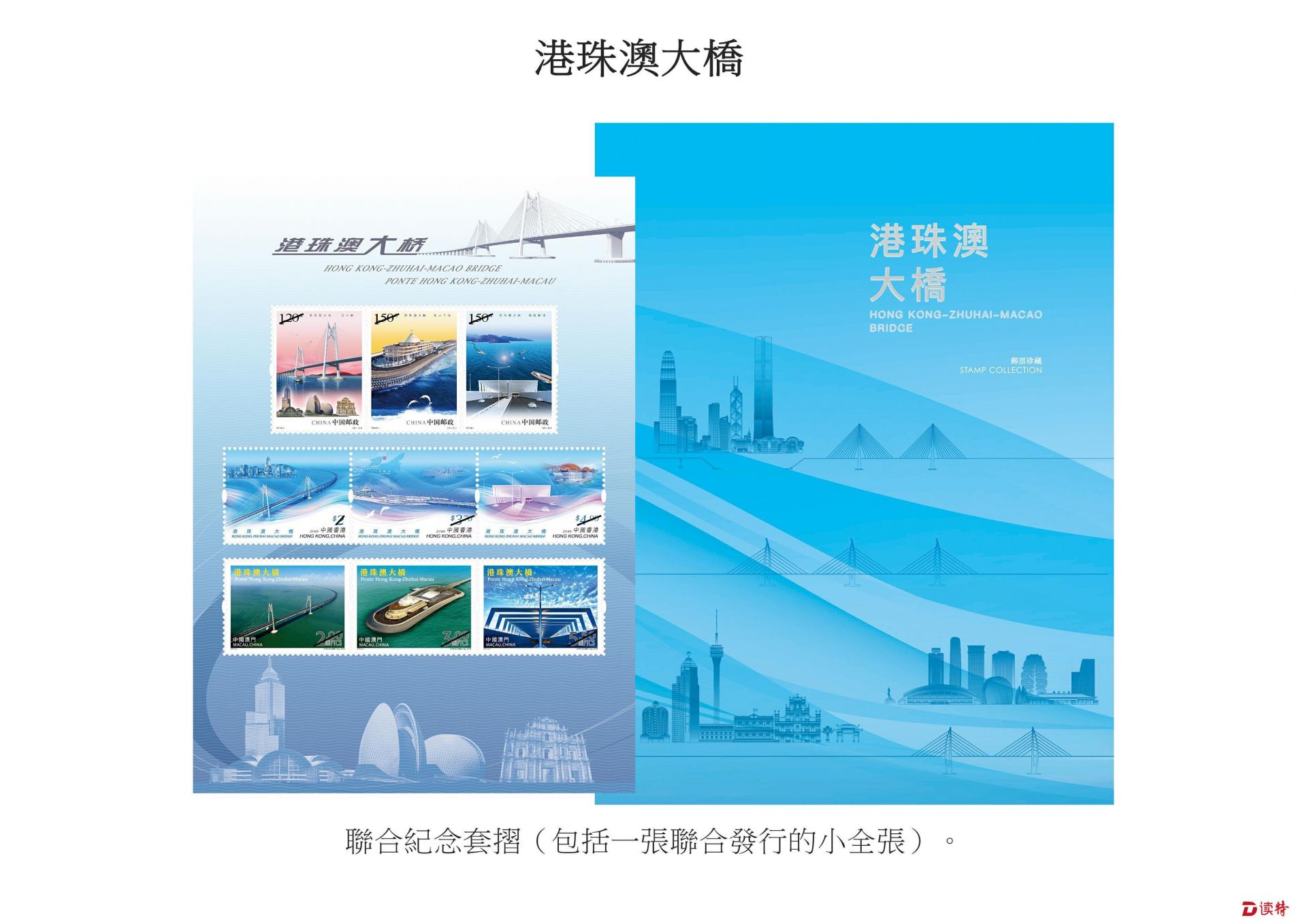 為紀念大橋啟用,中國郵政、香港郵政和澳門郵電于同日共同發(fā)行一款聯(lián)合紀念套折,內(nèi)附一張小全張,嵌有由三地郵政發(fā)行的特別郵票各一套。