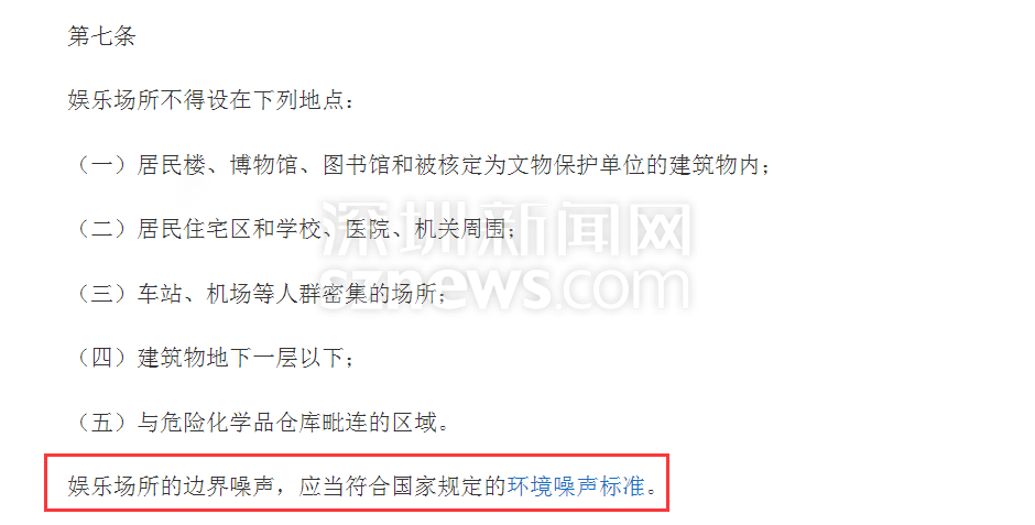 此外,該管理條例還對娛樂場所的邊界噪聲做出了明確規(guī)定,要求其邊界噪聲應(yīng)當符合國家規(guī)定的環(huán)境噪聲標準,即睡眠30分貝。