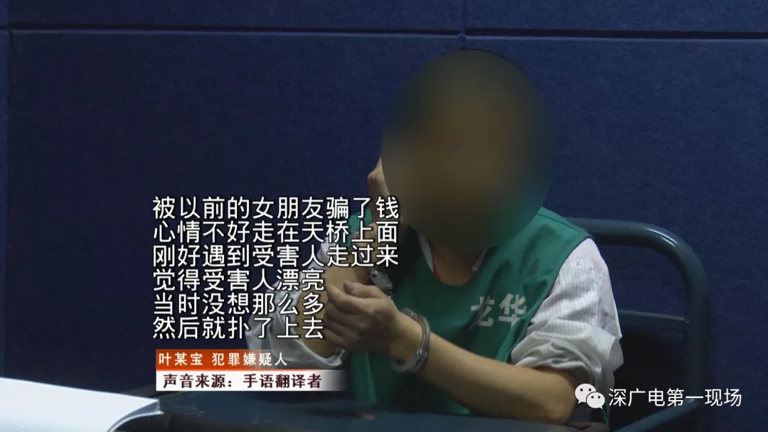 今天上午,記者在龍華油松派出所,見到了犯罪嫌疑人葉某寶。葉某寶是安徽人,今年31歲,在龍華區(qū)某工廠工作。在采訪時,記者發(fā)現(xiàn),犯罪嫌疑人葉某寶是名聽障人士,通過手語交談后了解到,11月2號晚上七點多,他途經(jīng)建設(shè)東路人行天橋時,對小王起了“歹心”。