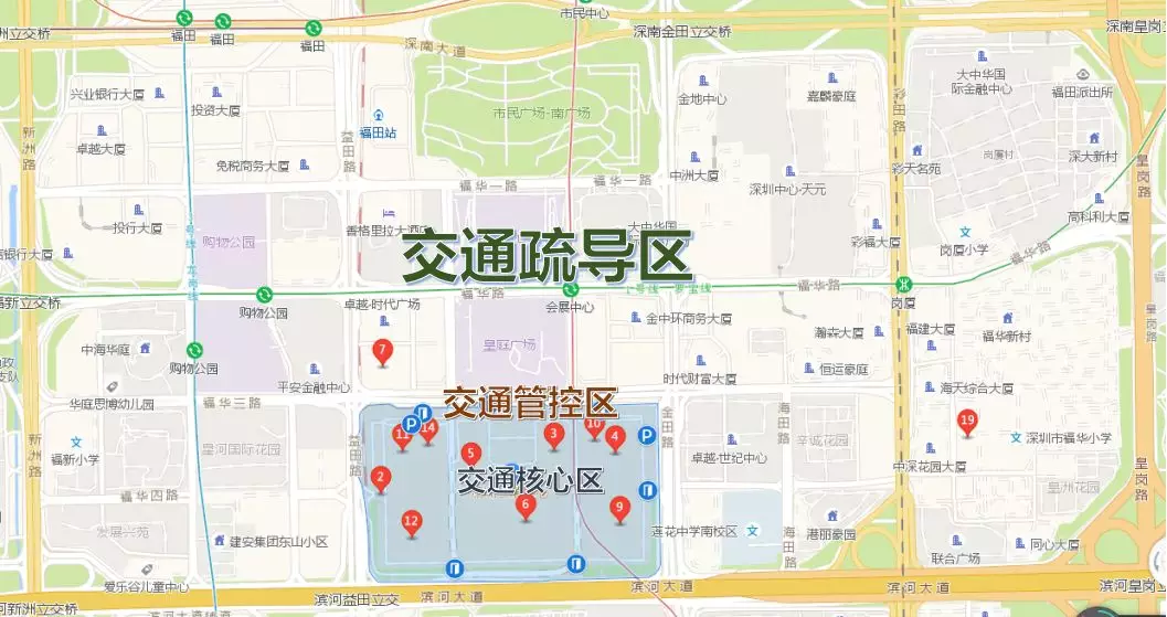 福華三路會展中心段(含)以南,濱河大道會展中心段輔道(含)以北,益田路會展中心段(含)以東,金田路會展中心段(含)以西的區(qū)域
