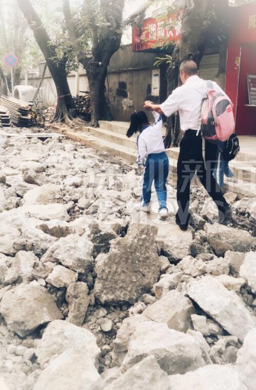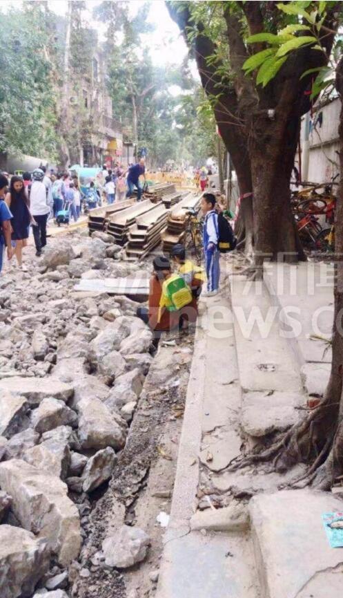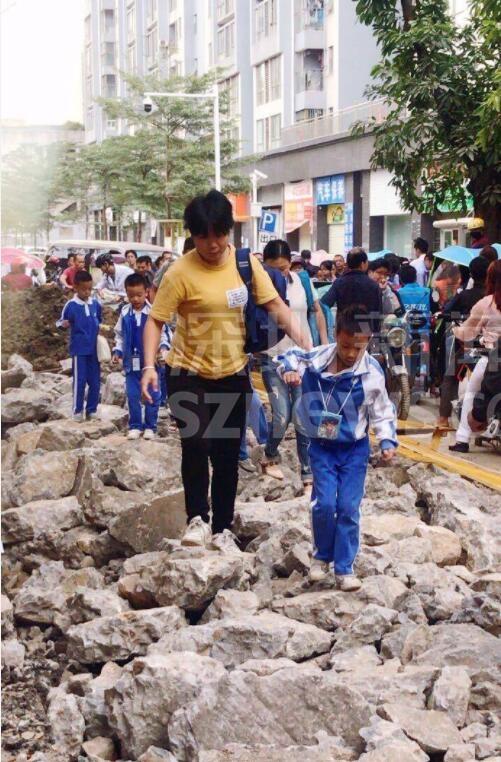 另有網(wǎng)友跟帖表示:同學(xué)們求學(xué)路坎坷,看得揪心!從現(xiàn)場圖可以看到,學(xué)生上下學(xué)都要穿過工地。路面被挖開,道路邊上只留下很窄的一條小道。上下學(xué)高峰期,成群結(jié)隊(duì)的學(xué)生在碎石穿行,旁邊小道上行人、三輪、電動單車堵成一鍋粥,存在很大的安全隱患。