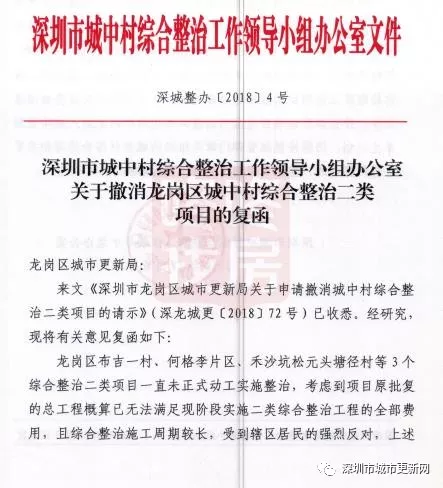 事實(shí)上,早在2018年7月,龍崗區(qū)城市更新局就已經(jīng)依據(jù)相關(guān)規(guī)定要求,批復(fù)取消這幾個(gè)城中村實(shí)施綜合整治的申請(qǐng),并予以公示。此次的批復(fù)公告實(shí)際為區(qū)城市更新局向上級(jí)城中村綜合整治領(lǐng)導(dǎo)和決策機(jī)構(gòu)(深城整辦)的請(qǐng)示文件所反饋的意見(jiàn)復(fù)函。