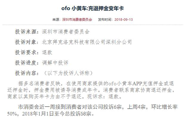 根據(jù)深圳市消費者委員會官網(wǎng)公布的消息,今年針對ofo的投訴增長迅速。1月1日至9月13日,投訴數(shù)量為58宗。截至11月14日,僅2個月時間,投訴增加180起,總數(shù)達(dá)238宗。