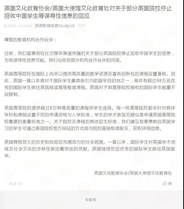 記者發(fā)現(xiàn),英國文化教育協(xié)會/英國大使館文化教育處對關于部分英國院校停止招收中國學生這一信息已做出官方回應:他們留意到在社交媒體渠道傳播的關于部分英國院校停止招收中國學生的信息,為有誤導性信息可能。