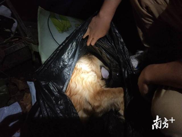 事后,愛心人士在南山市場(chǎng)附近的垃圾桶中找到了用黑色塑料袋包裹的小狗尸體,發(fā)現(xiàn)死去的寵物狗還是一只未成年的金毛幼犬。