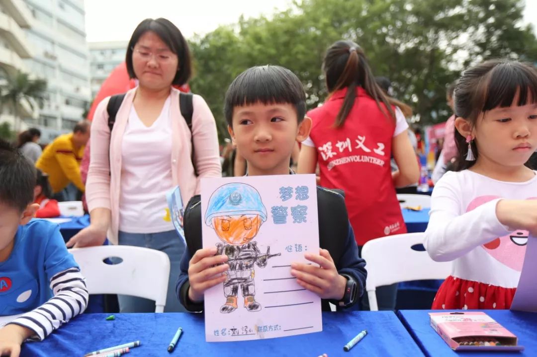 最具童年味道和勃勃生機(jī),大人和小孩現(xiàn)場(chǎng)涂鴉,寫出對(duì)警察想說(shuō)的話,也可以在畫架畫板上畫出自己心目中的警察,在孩子心中種下警察的種子,滿滿的寄語(yǔ),是對(duì)福田警察的祝福和期待,這也是警察蜀黍肩膀上沉甸甸的責(zé)任和勇往直前的力量!