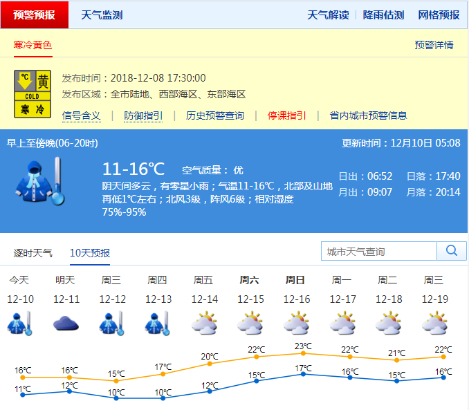 深圳新聞網(wǎng)12月10日訊(記者 施冰冰)據(jù)了解,受冷空氣補充影響,深圳10日陰天間多云,偶有零星小雨,早晨最低氣溫10-11℃,天氣陰冷;11日云量較多,日溫差??;12-13日新一股冷空氣影響,多云可見陽光,最低氣溫將降至10℃或以下;14日冷空氣減弱,氣溫回升。預(yù)計寒冷黃色預(yù)警信號將持續(xù)至13日前后。