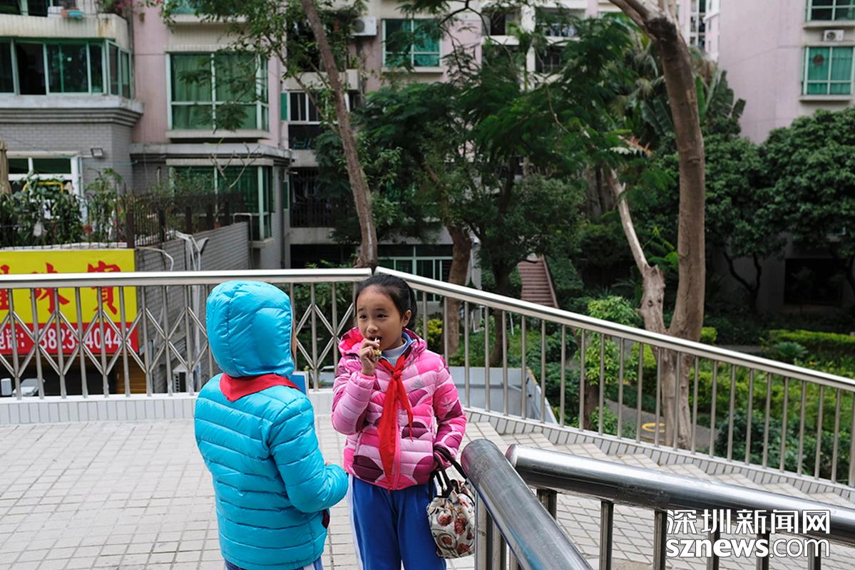 2018年12月12日中午,羅湖翠竹天橋,體感溫度依然很低,兩名學生穿著羽絨服御寒。