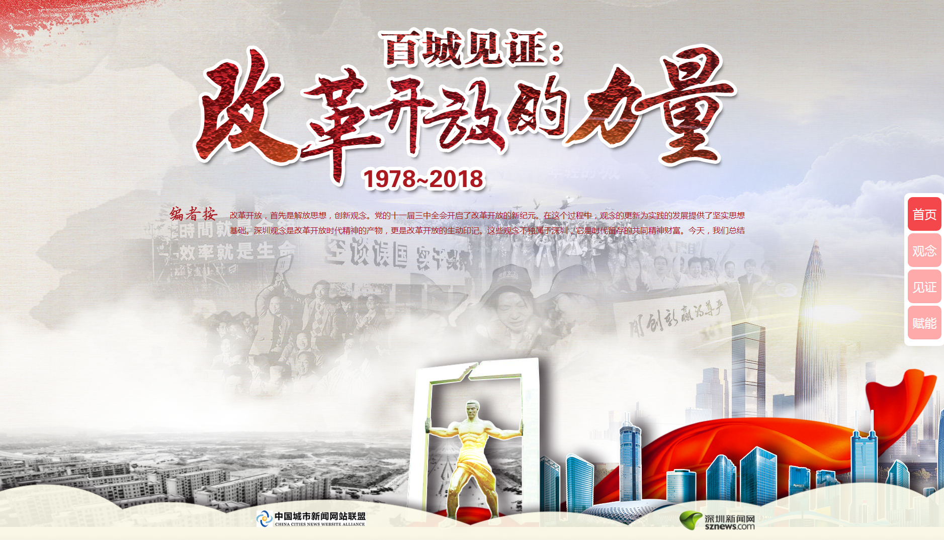此次活動(dòng)由中國(guó)城市新聞網(wǎng)站聯(lián)盟主辦,深圳新聞網(wǎng)承辦,活動(dòng)在今年10月中國(guó)城市新聞網(wǎng)站聯(lián)盟總編輯聯(lián)席會(huì)上正式啟動(dòng)。專題網(wǎng)頁(yè)采用全新H5技術(shù),用歷史原圖、視頻、音頻和文字交互呈現(xiàn)方式,詮釋改革、實(shí)干、擔(dān)當(dāng)、文明、開放、創(chuàng)新等深入民心的改革開放觀念,并發(fā)動(dòng)網(wǎng)盟近百家成員單位網(wǎng)站,深入挖掘當(dāng)?shù)爻鞘懈母镩_放的生動(dòng)案例和故事,報(bào)道這些代表性觀念對(duì)所在城市發(fā)展的巨大影響,共同描繪改革開放40年的生動(dòng)畫卷。