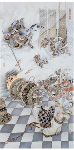 顧堅瓷板畫代表作再現了齊天大圣大鬧天宮的經典畫面(展覽方 供圖)