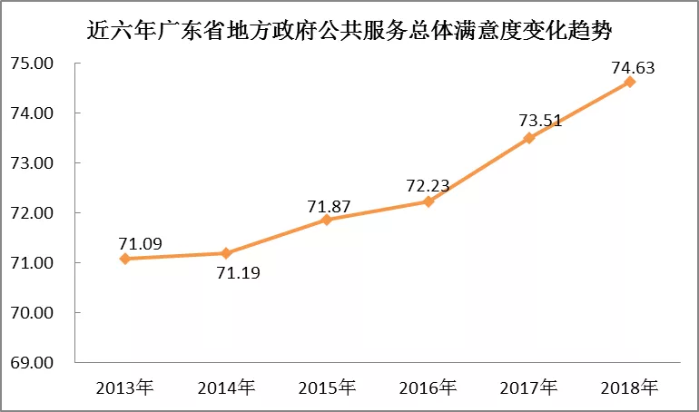 深圳新聞網(wǎng)2019年1月3日訊 近日,廣東省省情調(diào)查研究中心、廣東省社會(huì)科學(xué)院績效評估中心公布了《2018年廣東省地方服務(wù)型政府建設(shè)系列調(diào)研報(bào)告》(以下簡稱“報(bào)告”),今年該調(diào)研根據(jù)“公共服務(wù)”和“營商環(huán)境”雙向維度,由“廣東省地方政府公共服務(wù)公眾評價(jià)調(diào)查”和“廣東省營商環(huán)境公眾滿意度調(diào)查”兩個(gè)調(diào)查組成。今年調(diào)查共回收有效問卷28156份,結(jié)果顯示:2018年廣東省地方政府公共服務(wù)總體滿意度得分為74.63分,較去年提高1.12分,創(chuàng)十年來最高水平。