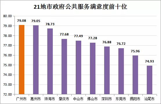 珠三角地區(qū)公共服務滿意度得分最高(77.14分),其次為粵東地區(qū)(74.55分)、粵北地區(qū)為69.79分;粵西地區(qū)得分最低,為68.34分。在21個地級以上市中,有15個地市政府公共服務總體滿意度超過70分,占全省21個地市的71.43%;總體滿意度較高的前五位依次為廣州市、惠州市、珠海市、肇慶市、中山市,均為珠三角區(qū)域城市;粵東西北滿意度較高的前五位地市依次為揭陽市、汕尾市、汕頭市、清遠市、潮州市。值得注意的是,廣州十年來首次躍居全省政府公共服務滿意度第一位,作為國家中心城市,公眾的期望一直較高,取得如此成績,反映出廣州在公共服務建設(shè)上取得了長足的進步。