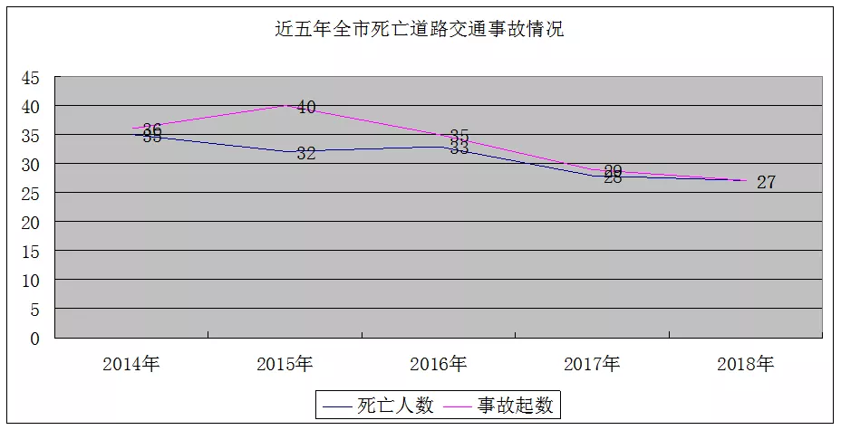 2014年至2018年春運(yùn),近五年的春運(yùn)期間我市共發(fā)生死亡道路交通事故156起、死亡168人。其中,2014年發(fā)生35起,2015年32起,2016年33起,2017年28起,2018年27起,呈逐年平穩(wěn)下降趨勢(shì)。