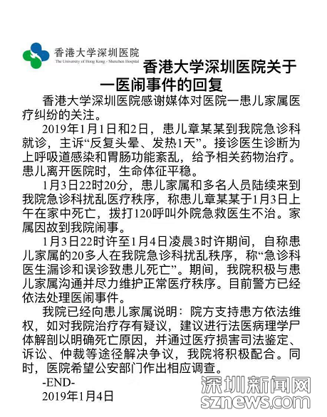 1月1日、2日,市民章先生的女兒因發(fā)燒在港大深圳醫(yī)院治療時(shí),被診斷為上呼吸道感染和胃腸功能紊亂。遵照醫(yī)囑吃完藥后,其女兒病情突然惡化,于1月3日死亡。