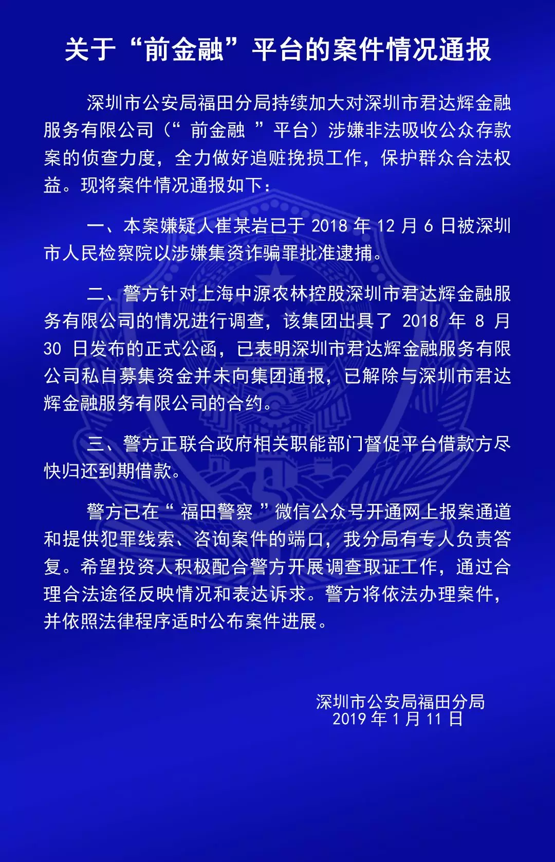 福田公安通報(bào)六家平臺(tái)涉嫌非法吸收公眾存款案的情況
