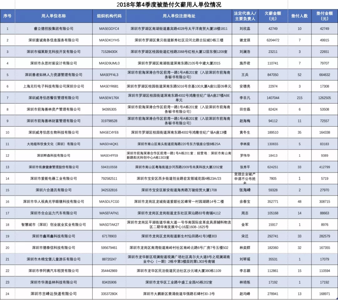 根據(jù)《深圳經(jīng)濟(jì)特區(qū)欠薪保障條例》第二十二條規(guī)定,深圳市人力資源保障局公布2018年第四季度拖欠員工工資并由各區(qū)人力資源部門啟動市欠薪保障基金墊付員工工資的用人單位情況。