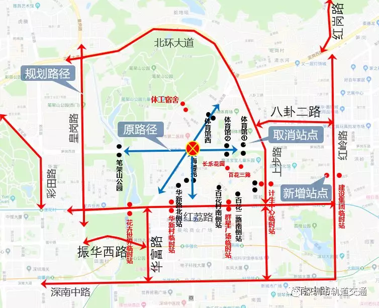 1.臨時取消站點(diǎn)15個:全封閉施工期間,取消體育館、筆架山公園、海馨苑、體育館西、百花一路等5對車站,及華新路北側(cè)站、百花二路南側(cè)站、百花村南側(cè)站等,共計(jì)15個站點(diǎn)(含分站),增設(shè)14個臨時??奎c(diǎn)(花卉世界臨時站、華新村臨時站、群星廣場臨時站、計(jì)生中心臨時站、建設(shè)集團(tuán)臨時站、體工宿舍、華富北屋村、長樂花園、百花三路)。(詳見圖3)