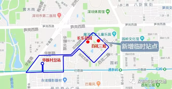 (2)新增華新村總站環(huán)線(單邊順時針運行),線路單向途經華富路、華新路、百花四路、百花三路、百花二路、百花五路、百花四路、華強北路、紅荔路。??咳A新村總站、華新村、市話大廈①、華新路、百花四路、長樂花園、百花三路、百花二路、百花村、百花四路、華新村總站。(詳見圖6)