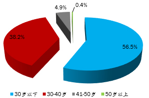 年齡方面,學員平均年齡為29歲,其中30歲以下的有24804人,占比56.5%;30-40歲的有16785人,占比38.2%;41-50歲的有2156人,占比4.9%,50歲以上的有157人,占比0.4%。