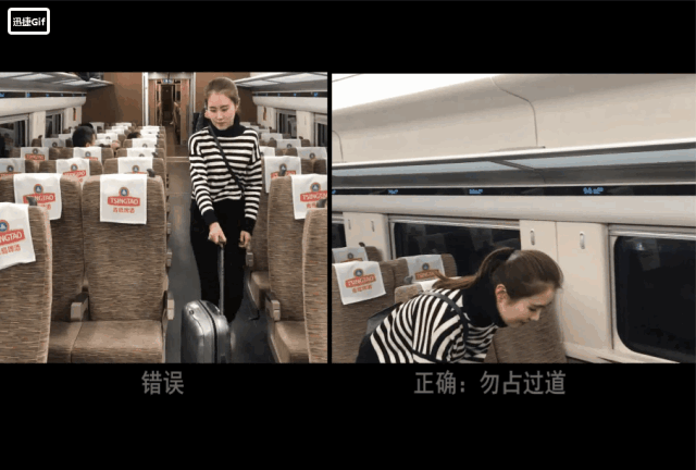 列車上,行李應(yīng)擺放好在行李架上,請(qǐng)勿擺放在過道,影響正常使用。