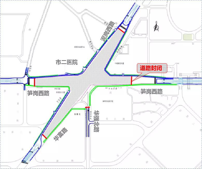 施工期間,對泥崗西路、華富路、筍崗西路、華強(qiáng)北路黃木崗立交部分路段進(jìn)行封閉,隔斷往來交通。