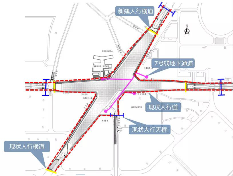 同時(shí),在筍崗西路、華富路、泥崗西路、華強(qiáng)北路靠近立交的一端設(shè)置掉頭開口,各方向車輛可在此掉頭繞行。