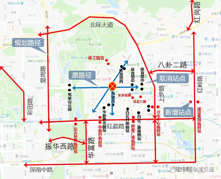 車行交通調(diào)整為:皇崗路 -紅荔路 -華富路 -華新路;上步路 -紅荔路 -華強(qiáng)北路 -華新路或上步路 -筍崗西路 -百花四路 -華新路。