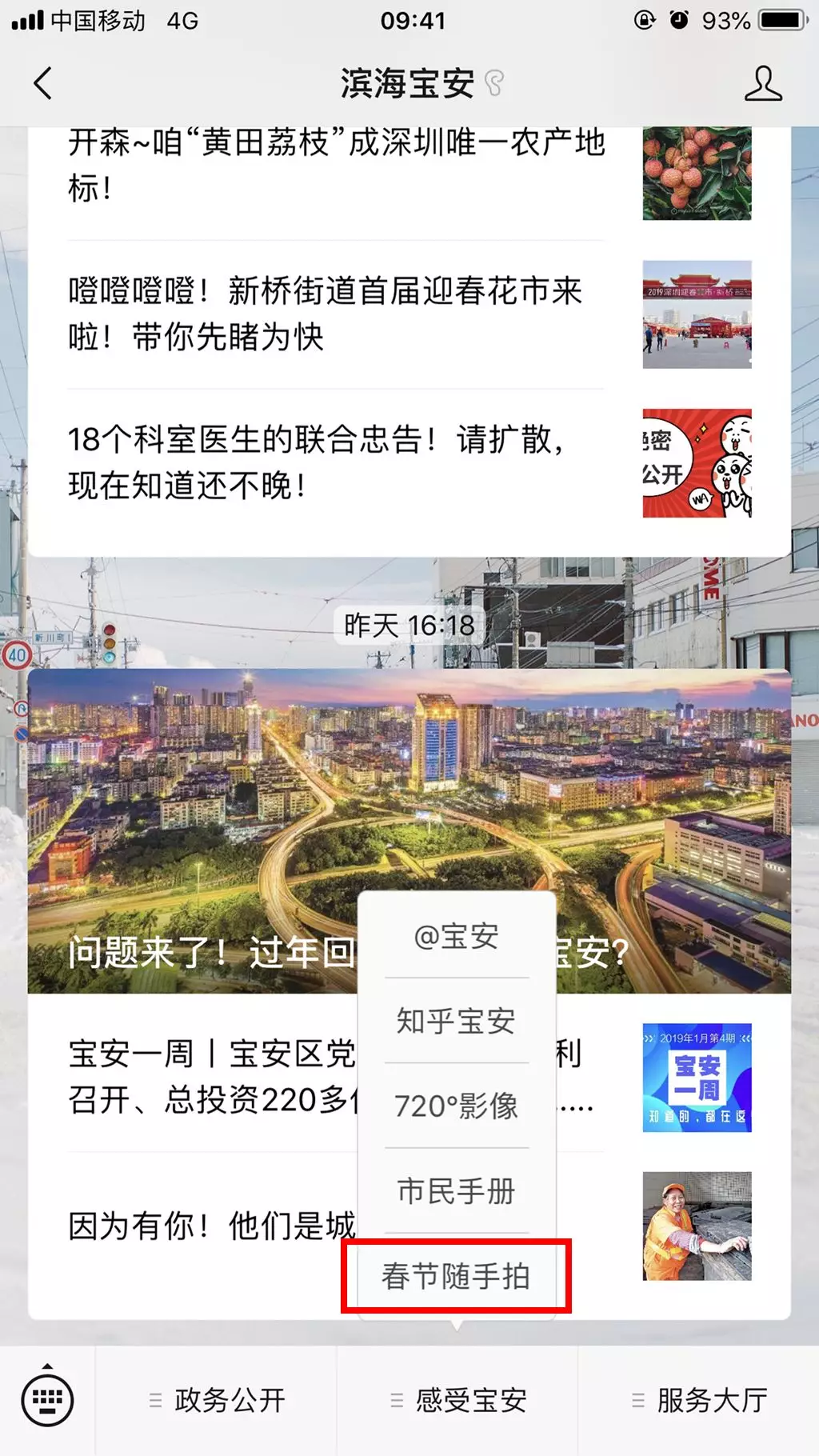 1、掃碼關(guān)注“濱海寶安”微信公眾號(hào),在下方菜單欄中點(diǎn)擊“春節(jié)隨手拍”參與活動(dòng)。