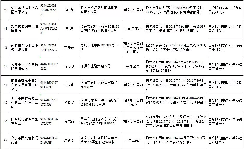 深圳新聞網(wǎng)2019年1月29日訊 (記者 劉婷)據(jù)廣東發(fā)布消息,省人社廳近日公布,2019年第一批用人單位重大勞動保障違法行為名單。到底是哪些企業(yè)在惡意欠薪?這些“老賴”企業(yè)的營業(yè)執(zhí)照、地址、法人等等超全信息都在這!