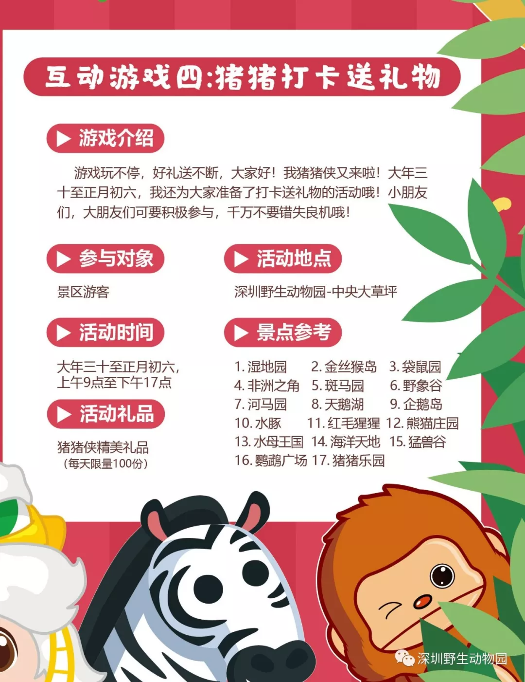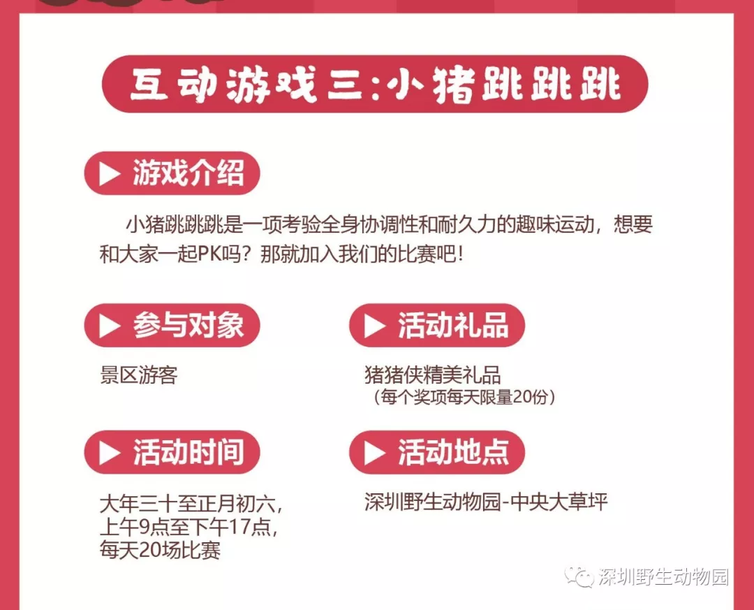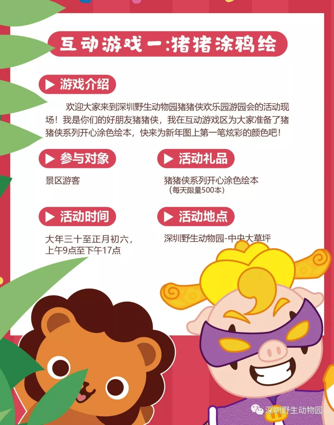 豬豬俠八大活動(dòng):豬豬俠變身生肖守護(hù)神,豬豬俠五大主角歡舞迎賓,童年小英雄陪你看動(dòng)物,八米巨型氣模與你合拍,動(dòng)手又動(dòng)腦豬豬涂鴉繪,一馬當(dāng)先小豬快跑,趣味小豬跳跳跳,集豬豬俠合影贏(yíng)精美禮品。