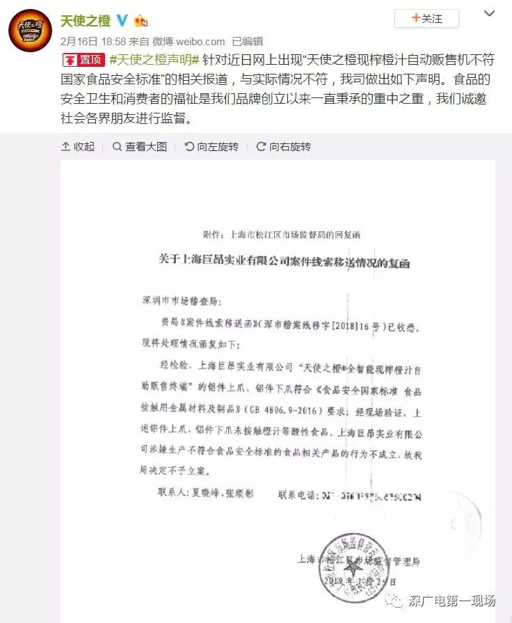 2月16日,“天使之橙”官方發(fā)表聲明,稱上海市松江區(qū)市場監(jiān)管局經(jīng)過現(xiàn)場檢查,并送第三方檢測機構檢測,認為“上下爪”并不會接觸橙汁等酸性食品,巨昂方面涉嫌違反《食品安全法》的相關行為不成立,該局不予立案。