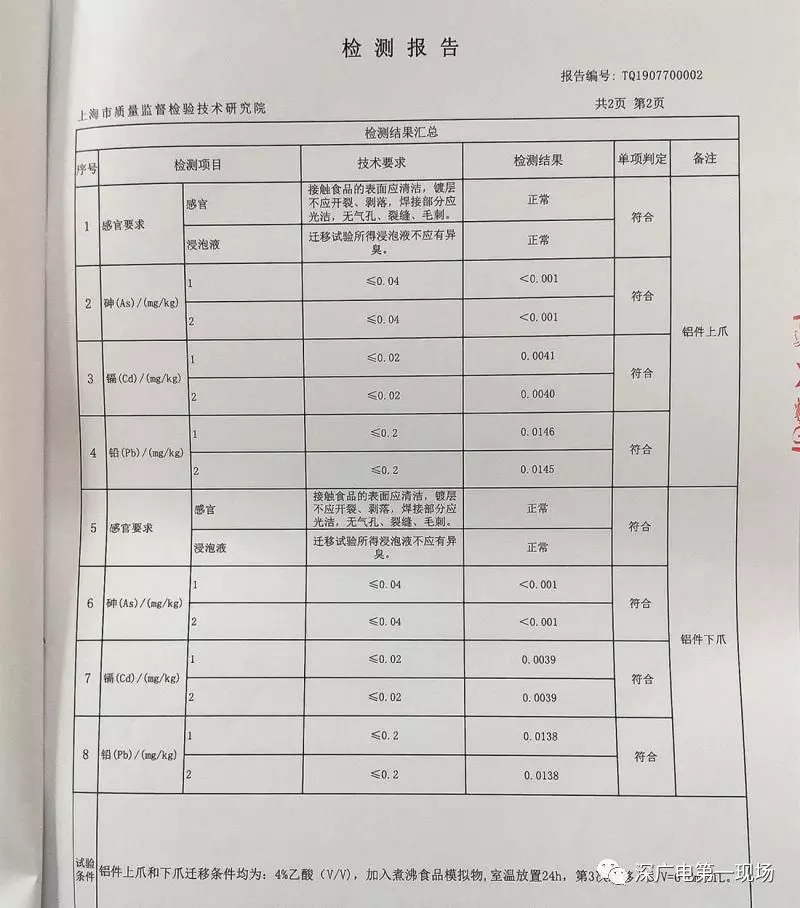 在現(xiàn)場,松江區(qū)市場監(jiān)管局還向記者出示了一份該局抽樣后委托上海市質(zhì)檢院進(jìn)行檢測的檢測報(bào)告,檢測對(duì)象是“天使之橙”現(xiàn)榨橙汁機(jī)的上下爪,檢測依據(jù)就是上述的我國國家標(biāo)準(zhǔn)《食品接觸用金屬材料及制品》。經(jīng)檢測,相關(guān)部件的檢測項(xiàng)目均符合上述標(biāo)準(zhǔn)。