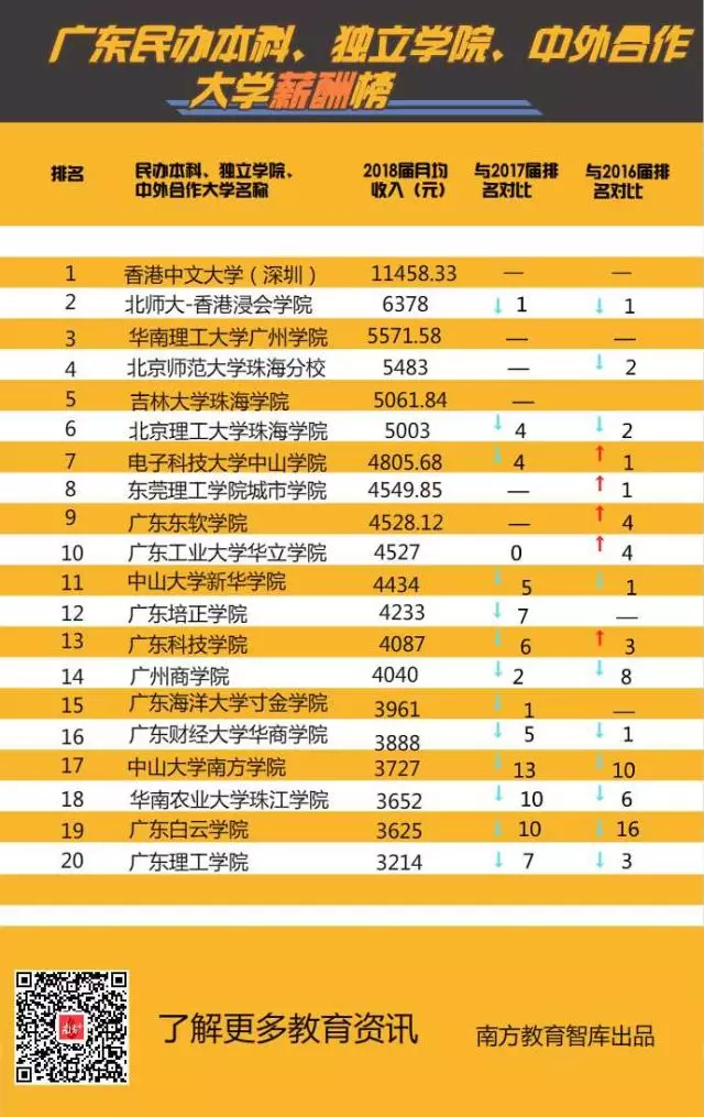 ▲廣東民辦本科、獨立學院、中外合作大學薪酬20強,港中文(深圳)成全省首個平均月薪過萬高校。
