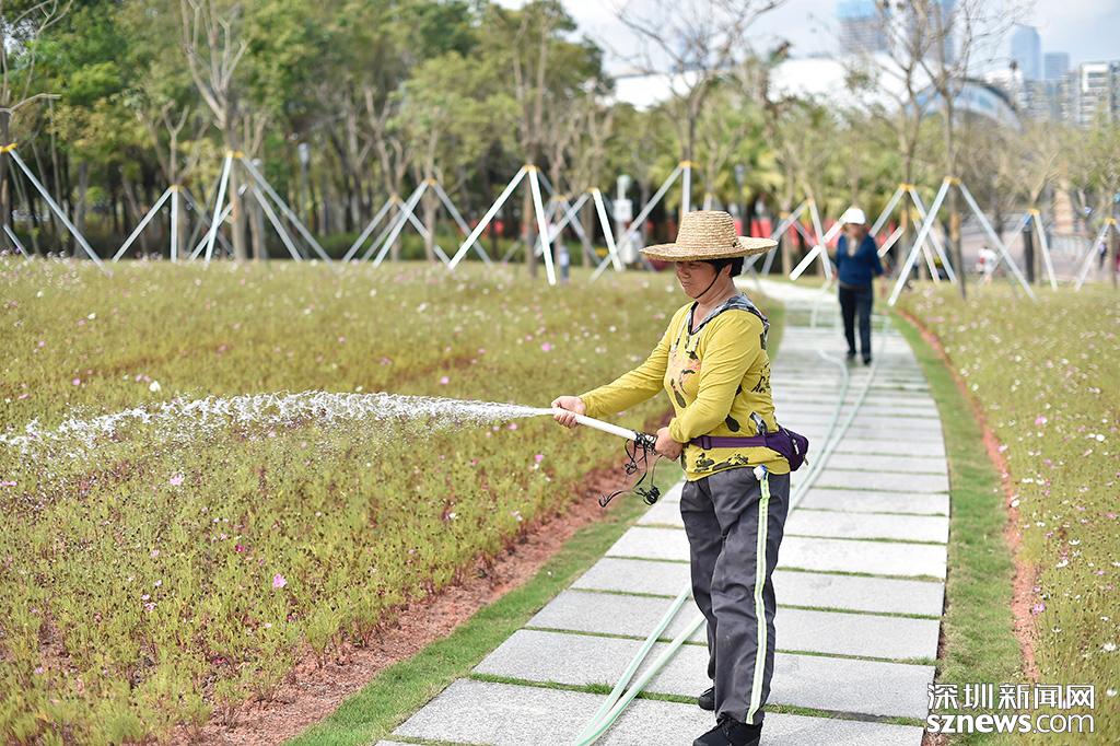 流花山的園林工作人員正在給花朵澆水,保證強(qiáng)太陽下花朵有充足水分