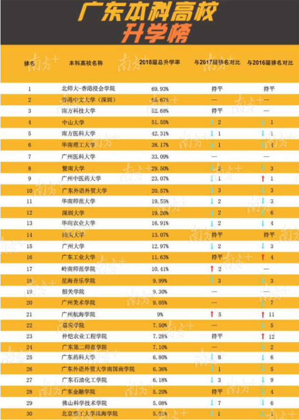 南方教育智庫統(tǒng)計(jì),截至2月中旬,全省有123所高校發(fā)布了2018屆相關(guān)數(shù)據(jù)。其中,“沖一流”類別的高校本科畢業(yè)生國內(nèi)升學(xué)率領(lǐng)先,其中南方醫(yī)科大學(xué)39.99%、中山大學(xué)33.31%、廣州醫(yī)科大學(xué)33.09%位列前3名,均超過33%。華南理工大學(xué)26.29%、廣州中醫(yī)藥大學(xué)21.29%、南方科技大學(xué)19.22%、暨南大學(xué)15.90%、華南師范大學(xué)13.57%、華南農(nóng)業(yè)大學(xué)12.43%和嶺南師范學(xué)院9.31%,分別位列第4名至第10名。