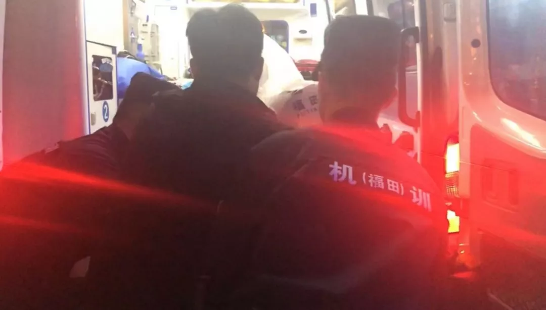 救護車趕到現(xiàn)場,隊員們爭分奪秒將男子抬上救護車。