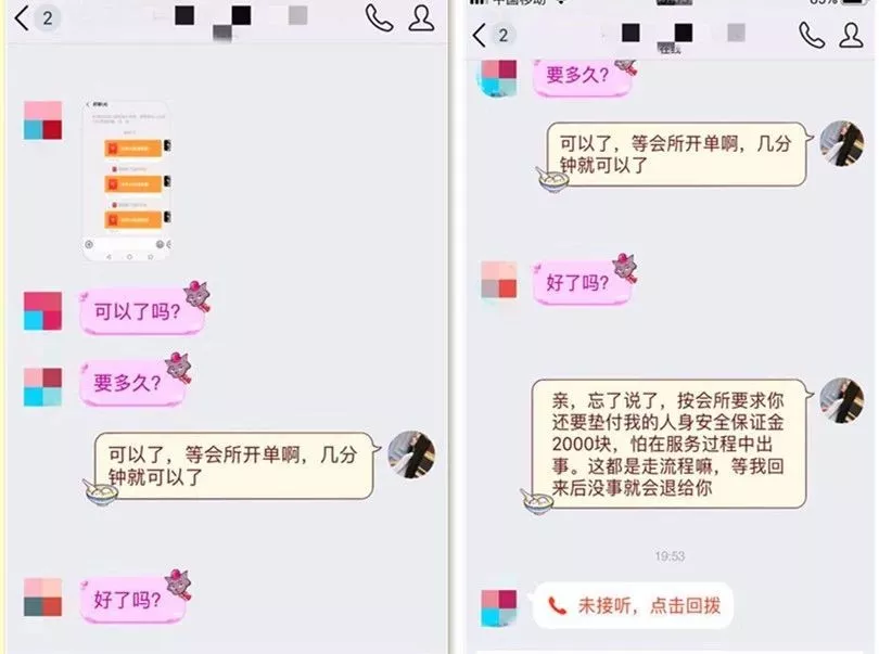 轉(zhuǎn)賬后,小李同學到一酒店開好房間,靜等“小妹”上門,但此時,對方要求再交1000元“風險押金”才能安排“小妹”過來。