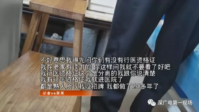 簡某的名片上,印著他是醫(yī)學(xué)院畢業(yè),有20多年治療經(jīng)驗,他的治療對骨折脫位通風腰突癥有特效,甚至半身不遂后遺癥都可以治。名片上,簡某有兩個營業(yè)點,分別在龍崗坂田和布吉。但地址只顯示大范圍,沒有房號。原來,找他看病,先得電話預(yù)約,然后他才告訴你具體房號。昨天,記者想辦法預(yù)約到簡某,他說可以在坂田五和路附近的吉豐樓給記者看病。記者來到現(xiàn)場,看到樓下沒有任何標識,不過電梯里有塊不大的牌子,寫著“跌打骨傷”電話號碼和門鈴0305字樣。